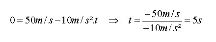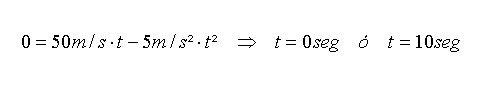 e) y f) Dado que la aceleración en la subida es la misma que en la bajada y que el desplazamiento es el mismo podemos responder teóricamente que si tarda 5 seg en subir tardará otros 5 seg en bajar de modo que volverá al piso luego de los 10 seg de haber partido con una velocidad del mismo módulo pero de sentido contrario, o sea que llegará con una velocidad de -50 m/s. Para resolverlo analíticamente consideremos que la posición referente al piso coincide con la coordenada 0 de nuestro eje de referencia de modo que podemos reemplazar y(t) por 0 y de allí despejar t de la ecuación de segundo grado resultante: