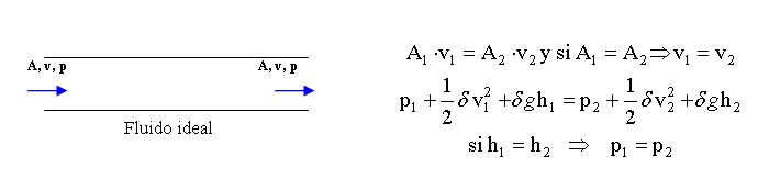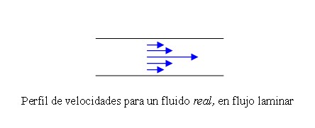 Si el fluido es “real” las fuerzas de rozamiento hacen que el fluido pierda energía, como la ecuación de continuidad sigue valiendo (el fluido no se pierde), las velocidades a lo largo del tubo son constantes, si el tubo es horizontal las alturas son iguales, por lo tanto para que disminuya la energía el único término que puede disminuir es el de la presión. Hay una caída de presión a lo largo del tubo debido al trabajo de las fuerzas de roce. Aclaramos que como la velocidad del fluido en un corte transversal es mayor en el centro y tiende a cero en las paredes del tubo, el caudal se calcula como el producto del área por la velocidad media en dicha sección.
