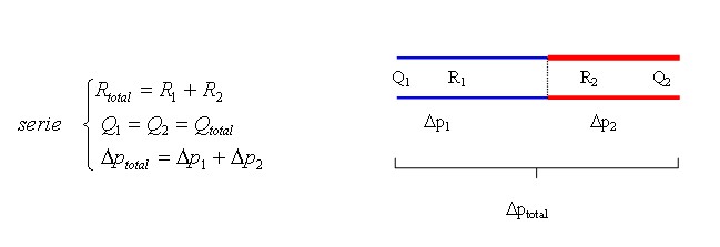 Si se conectan dos conductos uno a continuación del otro se dice que están en “serie”; el caudal por cada caño es el mismo debido a la ecuación de continuidad, y la diferencia de presión total es la suma de las diferencias de presión en cada caño. De esto es fácil de demostrar que el conjunto se puede representar como un solo conducto cuya resistencia total es la suma de cada uno por separado: