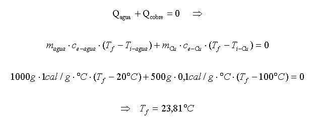 Notemos que la temperatura de equilibrio estará siempre entre las temperaturas iniciales de ambos cuerpos (20°C y 100°C). Como el agua pasa de 20°C a 23,81°C siempre permanece en estado líquido (recordemos que la temperatura de ebullición del agua es de 100°C), y el cobre se mantiene en estado sólido, en este problema no hay ningún cambio de estado.