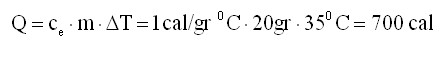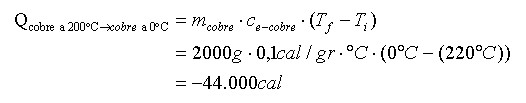 En total el hielo necesita recibir 18.000 cal (2000+16000) para pasar a agua a 0ºC. Veamos cuantas calorías cedería el cobre para bajar su temperatura hasta los 0ºC: