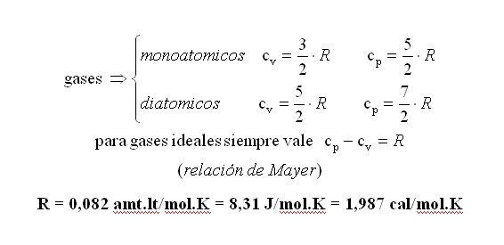 Para gases, el calor específico depende de la forma en que se le suministra el calor, dependiendo que se le suministre (o quite) calor a volumen constante o a presión constante. Además el valor del calor específico molar de un gas depende de la cantidad de átomos que constituyen la molécula: