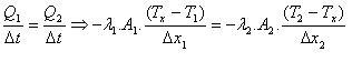a) Esta disposición se denomina en serie e introduce una incógnita nueva Tx que es la temperatura de equilibrio entre ambos tabiques separadores, considerando que la potencia calórica es la misma ya que de lo contrario el calor se acumularía o desaparecería en algún punto interior, (suponemos que las placas están aisladas lateralmente) por lo tanto para cada bloque planteamos la expresión de Fourier resultando: