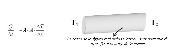 La ley de Fourier permite calcular el calor que atraviesa una sección del material por unidad de tiempo, también llamado “potencia calórica”. La cantidad de calor por unidad de tiempo que atraviesa el material es proporcional al área (A) de la sección transversal del conductor y al cociente entre la diferencia entre dichas temperaturas y la longitud del medio conductor (∆x). La constante de proporcionalidad l depende del medio donde se transmite el calor y se llama coeficiente de conductividad del medio[1].