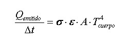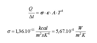 La energía radiante emitida o absorbida por un cuerpo por unidad de tiempo, es directamente proporcional al área de su superficie externa A, al coeficiente de emisividad ε y según la ley de Stefan-Boltzmann a la cuarta potencia de la temperatura absoluta.