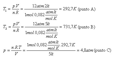 Dejamos para el alumno con interés de aprender dos actividades: una de ellas es el cálculo de la variación de energía interna, trabajo y calor correspondientes al ciclo ABCA, estimando previamente si estos valores son nulos, positivos o negativos. La otra, es volver a realizar los cálculos propuestos utilizando las expresiones que permiten calcular el calor, Q, y la variación de la energía interna, ΔU, independientemente del número de moles, lo cual facilita las operaciones ya que no es necesario el cálculo de las temperaturas y no es necesario contar con n como dato. Nos referimos a la aplicación de ΔU = cv / R .(pfVf - pi.Vi) ; Qv = cv / R.V.(pf - pi) y Qp = cp / R . p.(Vf - Vi). La discusión de los resultados obyenidos la esperamos en foro correspondiente a esta unidad o se desarrollará en clase si los tiempos los permiten.