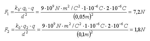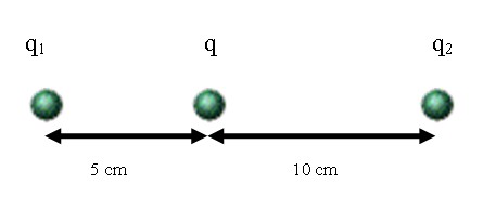 (Notemos que como las cargas q1 y q2 son iguales y la distancia entre q2 y q es el doble que entre q1 y q, la fuerza entre q2 y q será 4 veces menor que entre q1 y q)