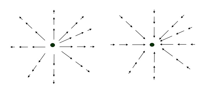 Vectores campo eléctrico E para una carga puntual positiva y otra negativa.