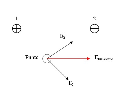 Si tenemos muchas cargas puntuales el campo sobre un punto es la suma vectorial de los campos eléctricos debido a cada carga que lo produce en ese punto.
