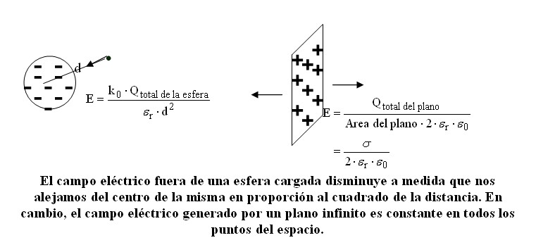 Finalmente, aunque sin realizar los cálculos matemáticos, mencionemos dos resultados importantes: primero es que el campo eléctrico en el exterior de una esfera cargada con las cargas distribuidas uniformemente en su interior (o en su superficie si se trata de un conductor), es exactamente igual al campo que produce un cuerpo puntual con toda la carga concentrada en el centro de la esfera. Otra configuración que vamos a utilizar es la de un plano conductor cargado uniformemente, el campo eléctrico generado por el plano en las cercanías de este es perpendicular al plano y su módulo es, si las cargas están distribuidas uniformemente, la carga total del plano dividida por el área (la densidad superficial de carga), sobre 2×er×e0, si además el plano puede considerarse muy grande (llamado plano infinito) el campo es constante en cualquier punto, es decir no importa cuanto nos alejemos, ¡el campo siempre vale lo mismo!.