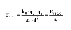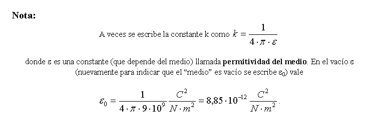 La fuerza eléctrica entre dos cargas no es la misma si las cargas están en el vacío o si están en otro medio. Para el vacío la constante k (denominada en este “medio particular” k0) vale 9×109 N×m2/C2 (en el aire su valor es prácticamente el mismo).