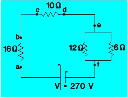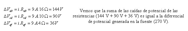 Ahora veamos como calcular la ddp entre los puntos a y b, c y d, e y f. O sea calcularemos la ddp entre los extremos de cada resistencia. Para eso usaremos la segunda figura. Sabemos por la ley de Ohm que la ddp entre los extremos de un trozo de circuito es igual al producto de la intensidad de la corriente que circula por dicho trozo por la resistencia del mismo. Al estar las resistencias de la segunda figura conectadas en serie la intensidad que las recorre es la misma que la intensidad total, o sea, 9 Amperes. De modo que: