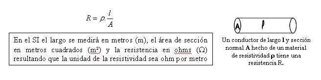 La resistencia de una tubería a la circulación de un fluido viscoso es mayor cuanto más larga sea esta y disminuye a medida que aumenta su sección. De la misma manera, cuanto más ancho sea un conductor, más fácilmente circularán los electrones y por el contrario, cuanto más largo sea más resistencia tendrá. Esto es debido a que al pasar los electrones por un conductor sufren una serie de choques contra los átomos del mismo, lo que determina una resistencia al paso de la corriente eléctrica. La resistencia depende del tipo de conductor (o sea de que material esta hecho) y de sus dimensiones. Entonces podemos decir que la resistencia de un conductor es directamente proporcional a la longitud del mismo l e inversamente proporcional a su sección normal A. La constante de proporcionalidad se denomina resistividad y depende del material que compone al conductor y su temperatura. Usaremos la letra griega ρ para referirnos a la resistividad. En la tabla se muestra las resistividades de algunos materiales conductores. En los metales esta aumenta con la temperatura[4]. Por lo tanto para calcular la resistencia de dicho conductor aplicaremos la siguiente expresión: