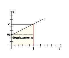 Además, el gráfico de la velocidad en función del tiempo nos permite concluir que el área encerrada entre la gráfica (en este caso una línea horizontal, ya que la velocidad es constante), el eje horizontal y dos instantes cualesquiera equivale al desplazamiento del móvil en ese intervalo de tiempo.