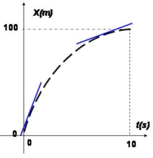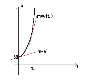 En el gráfico se han marcado dos rectas tangentes (cuya pendiente indicamos como m), una de ellas correspondiente al instante inicial y la otra a un tiempo cualquiera t1. Esto permite comprobar que la velocidad ha ido en aumento, ya que si tenemos en cuenta que las pendientes de estas rectas representan las velocidades respectivas, vemos que la pendiente de la segunda de las rectas es mayor que la de la recta trazada por el punto inicial, de modo que la velocidad en el instante t1 es superior a la del instante inicial.