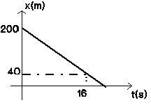 En el gráfico vemos una recta decreciente, o sea, de pendiente negativa. Sabemos que se trata de un MRU porque su gráfica x(t) es una recta y además como la pendiente de la recta representa la velocidad, esta debe ser negativa, o sea que el móvil se mueve en el sentido de las x´s decrecientes. En efecto, conocemos dos coordenadas del recorrido ya que de acuerdo con el gráfico en tiempo 0 el móvil se hallaba en la posición +200 m y que a los 16 segundos se encontraba en la posición de los +40 metros, moviéndose hacia el origen de coordenadas. Calculemos entonces su velocidad empleando: