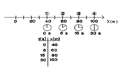 La figura nos muestra el estudio del movimiento de un cuerpo a lo largo de una línea recta, en la cual el punto considerado como referencia coincide con el origen de nuestro sistema de coordenadas y en donde hemos elegido el sentido positivo hacia la derecha. Hemos colocado observadores al costado del camino con sus cronómetros sincronizados y hemos registrado cuatro situaciones anotando el punto del sistema de coordenadas que ocupaba el móvil (o sea la posición del móvil) y el instante de tiempo correspondiente obtenido consultando nuestros cronómetros. Así cuando pusimos en marcha los cronómetros vimos el móvil pasaba por la coordenada de los 40 m, luego a los 5 segundos por la coordenada 60m, etc, y con estos datos hemos confeccionado una tabla de valores.
