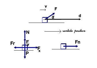Si observamos la segunda figura vemos las fuerzas aplicadas al cuerpo en un diagrama de cuerpo libre, en donde ya hemos descompuesto a la fuerza F en una componente paralela al movimiento Fx y otra perpendicular Fy. Es fácil sacar de antemano las siguientes conclusiones: