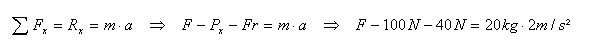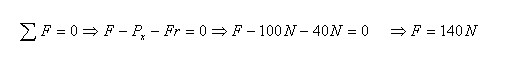 En el eje “x” actúan la fuerza paralela al plano F con sentido positivo y en sentido contrario, Px y la fuerza de rozamiento Fr. Aplicando la segunda ley de Newton: