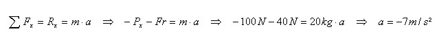 c) Si dejamos de empujar el cuerpo este continuará moviéndose con menor rapidez hasta detenerse. Por lo que el cuerpo que se hallaba ascendiendo por el plano inclinado comenzará a desacelerarse debido a la acción de la fuerza de roce y la componente Px del peso, ambas de sentido contrario al del movimiento. Podemos calcular el valor de la aceleración nuevamente aplicando el segundo principio: