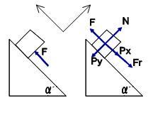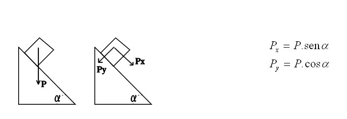 Cuando un cuerpo está apoyado en un plano que posee cierta inclinación respecto de la horizontal, formando un ángulo α por sobre la misma, resulta conveniente descomponer la fuerza peso en dos componentes: una de ellas con dirección paralela al plano y la otra perpendicular al mismo cuyos valores se determinan con las siguientes expresiones (el ángulo de inclinación del plano con el piso, α, coincide con el ángulo que forman P con Py):