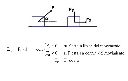 Si la fuerza actúa en forma oblicua al movimiento podemos calcular su trabajo fácilmente descomponiendo a la fuerza F en una dirección paralela al movimiento (que llamaremos Fx), y otra perpendicular (Fy) y luego calculamos el trabajo de Fx directamente, ya que como Fy es perpendicular al movimiento esta componente no le entrega ni le quita energía (el trabajo de Fy es cero).