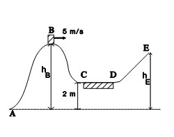 Un cuerpo de 2 kg parte del reposo del punto A de la figura impulsado por un motor que actúa hasta el punto B, en donde lo abandona con una velocidad de 5 m/s. Desliza por una vía sin rozamiento, excepto entre los puntos C y D, separados por 5 m, entre los cuales actúa una fuerza de roce de 10 N y se detiene justo en el punto E. Si al pasar por D su velocidad es de 8 m/s calcular: