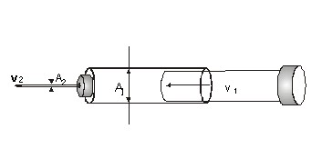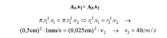 Una jeringa hipodérmica de radio interior 0,5 cm inyecta un líquido ideal a través de una aguja de medio milímetro de diámetro. El émbolo de la jeringa se mueve a una velocidad de v1 = 1 mm/s. Calcular la velocidad de salida del líquido por la aguja.
