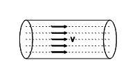 Flujo laminar en una tubería de sección constante por la cual circula un líquido ideal. Las líneas punteadas representan las llamadas líneas de corriente (también se las denomina venas líquidas). En el flujo laminar estas líneas no se cruzan y para una misma sección la velocidad de las partículas es la misma.