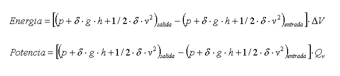 Donde ΔV es el volumen que atraviesa la bomba. Si queremos calcular la potencia que desarrolla la bomba, recordando que potencia es energía sobre tiempo y la definición de caudal (∆V/∆t) obtenemos: