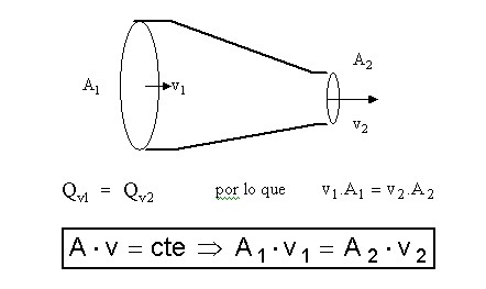 La expresión anterior es conocida como la Ecuación de continuidad, que representa la “Ley de conservación de la Masa” para el movimiento de líquidos en régimen estacionario o permanente. La velocidad de un líquido que escurre por una vena o tubo de forma arbitraria es, en cada sección, inversamente proporcional al área de esa sección. Se observa por lo tanto que en las secciones de mayor área, la velocidad del fluido es menor y viceversa. De esta manera, para un determinado caudal y siendo conocidas las secciones de la tubería, podemos determinar la velocidad con que las partículas de un fluido la atraviesan. Esta ecuación es válida tanto para fluidos ideales o reales, las únicas hipótesis que deben cumplirse es que el fluido pueda ser tratado como un fluido incompresible y que no existan fuentes ni sumideros.