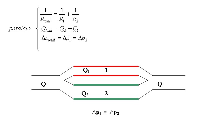 Si un conducto se bifurca (o ramifica) y luego se vuelven a juntar se dice que están en “paralelo”, el caudal total es la suma de los caudales de cada uno y la diferencia de presión en los extremos de cada caño es la misma, los dos caños se pueden reemplazar por uno tal que la inversa de la resistencia total de ese único caño sea la suma de las inversas de la resistencia de cada uno por separado: