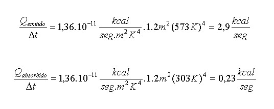Un cuerpo perfectamente negro tiene una superficie externa de 2 m2 y una temperatura de 300 ºC (573K). Se coloca en un ambiente que se encuentra a 30 ºC (303K). Calcular cuanto calor por unidad de tiempo absorbe y emite en esas condiciones.