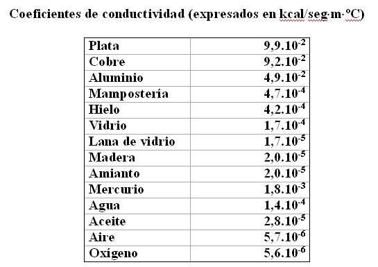 Entre el depósito superior y el inferior existe una diferencia de temperatura de 100ºC supuesta constante, siendo el superior el depósito de mayor temperatura. Están separados por un cuerpo de 4 m2 y 10 cm de espesor. Calcular la cantidad de calor conducida al cabo de una hora si el cuerpo es de: