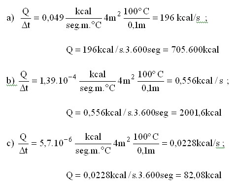 En cada caso primero vamos a calcular la potencia calórica y luego la cantidad de calor que ha pasado al cabo de una hora: