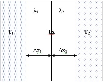 a) Esta disposición se denomina en serie e introduce una incógnita nueva Tx que es la temperatura de equilibrio entre ambos tabiques separadores, considerando que la potencia calórica es la misma ya que de lo contrario el calor se acumularía o desaparecería en algún punto interior, (suponemos que las placas están aisladas lateralmente) por lo tanto para cada bloque planteamos la expresión de Fourier resultando: