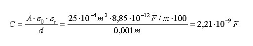 Si tenemos un capacitor de placas planas paralelas, con 25 cm2 el área de cada placa, separadas por una distancia de 1 mm, y en su interior colocamos un material de constante dieléctrica 100, calcular: