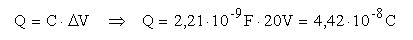 b) La carga es igual a la capacidad multiplicada por la ddp entre sus placas, al conectarlo con una pila de 20 V, el capacitor se carga hasta que la ddp entre sus placas también sea de 20 V, por lo tanto: