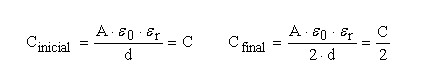 Es decir que la energía almacenada aumenta un 100%. ¿De donde proviene esa energía? Al separar las placas debemos realizar un trabajo para vencer las fuerzas eléctricas que tienden a juntarlas ya que tienen cargas opuestas, nos cuesta trabajo separar las placas y ese trabajo hace que aumente la energía del capacitor. También podemos ver que el campo eléctrico en el interior del capacitor no varía, pero la ddp entre placas aumenta al doble.