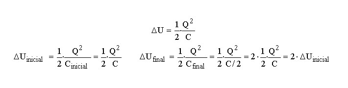 Si separamos la distancia entre placas al doble manteniendo el capacitor desconectado de la fuente la carga no cambia, ya que las cargas no tienen por donde “escaparse” de las placas, luego a la energía almacenada nos conviene escribirla en función de la carga (que no cambia), y de la capacidad a (que disminuye a la mitad), comparando las energías inicial y final: