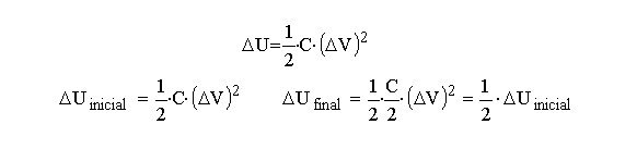 b) En este caso la capacidad también disminuye a la mitad, ya que la capacidad es una propiedad geométrica que no depende de la carga ni de la ddp del capacitor. Ahora si mantenemos el capacitor conectado a la pila, la fuente puede entregarle o sacarle cargas a las placas, pero en este caso sabemos que la ddp entre placas no va a cambiar. La carga de cada placa va a variar de manera que la ddp entre las placas sea igual a la tensión de la pila, por lo tanto la energía conviene escribirla en función de DV que sabemos que no varía, y de la capacidad que disminuye a la mitad.