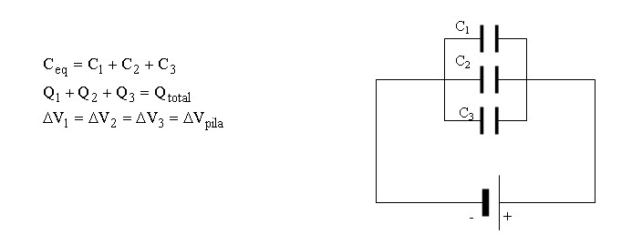 Si conectamos cada placa del capacitor entre sí, obtenemos un circuito paralelo de capacitores. En estos circuitos la ddp en cada capacitor es la tensión de la pila, ya que cada placa del capacitor esta conectada directamente a la pila, y la carga total que entrega la pila se distribuye en cada uno de los capacitores. De esto podemos demostrar que los capacitores se pueden reemplazar por uno solo de capacidad equivalente la suma de todas las capacidades.