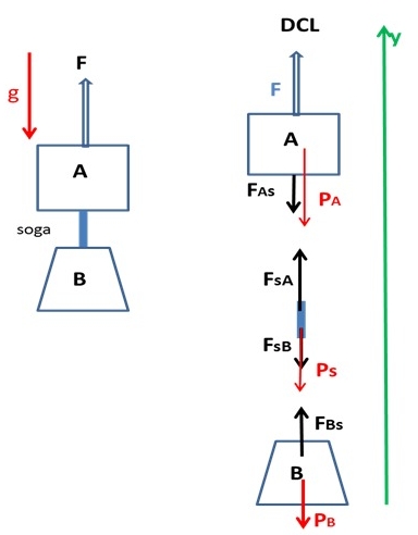 F - PA - Ps - PB = (mA + mS + mB) a --> a = (F - PA - Ps - PB ) / (mA + mS + mB)